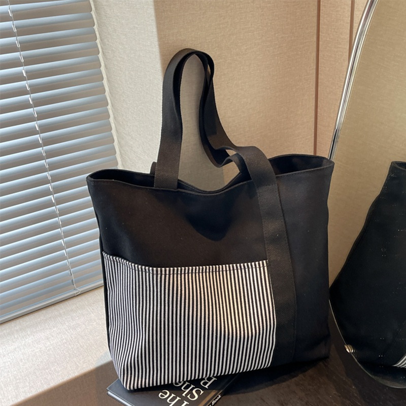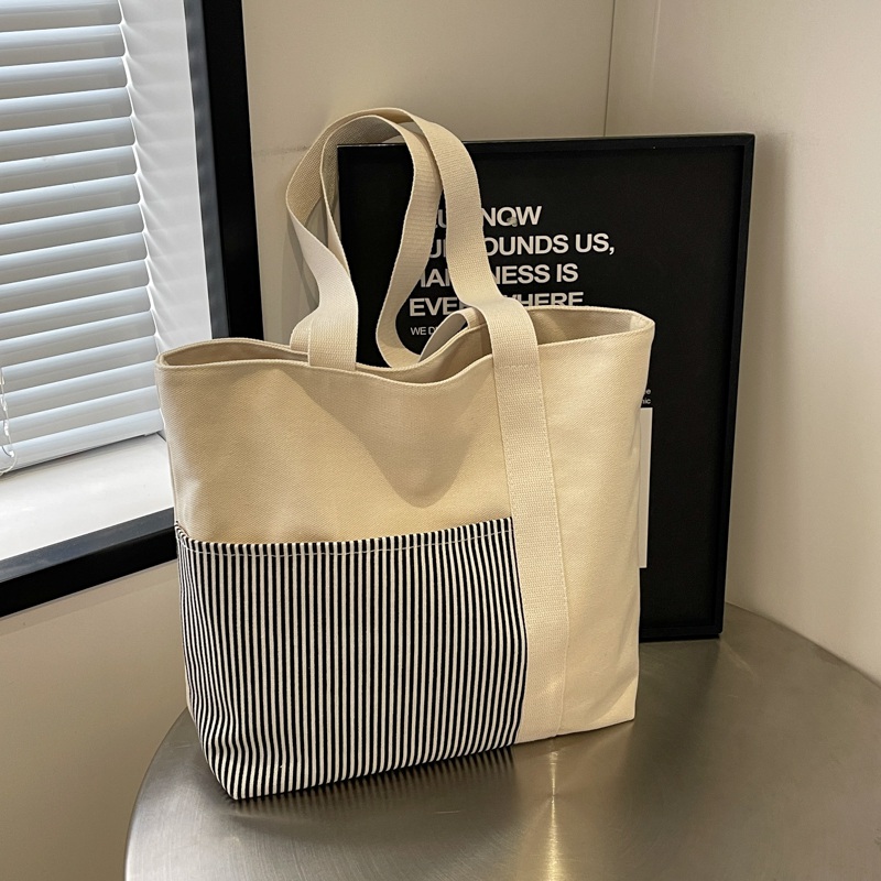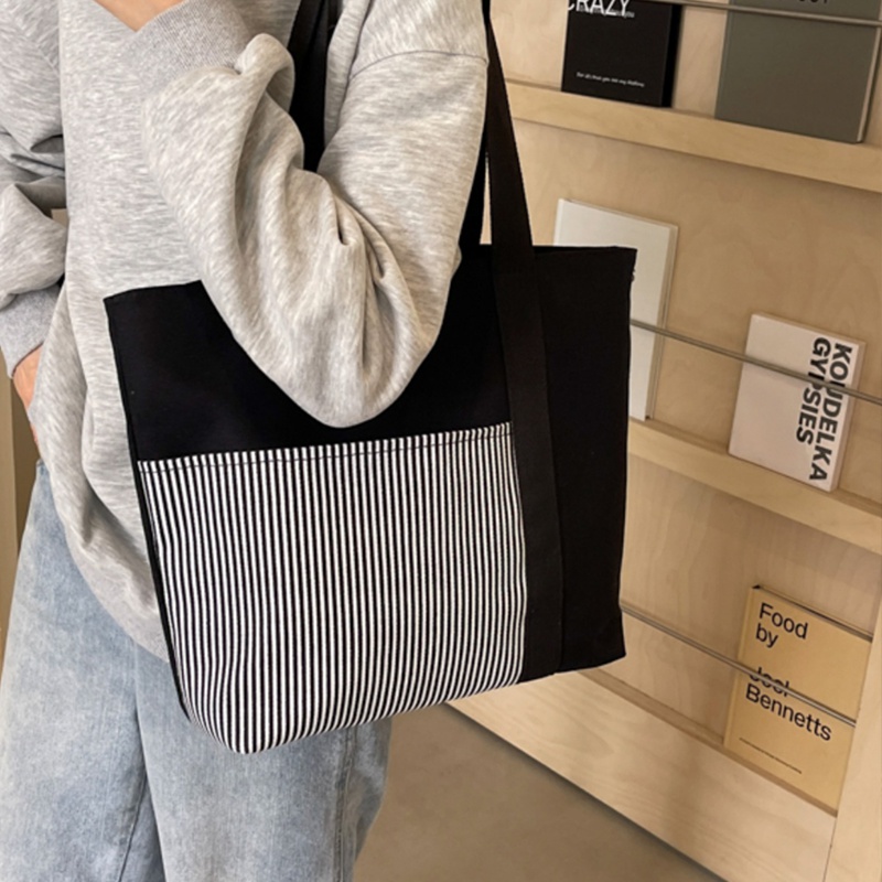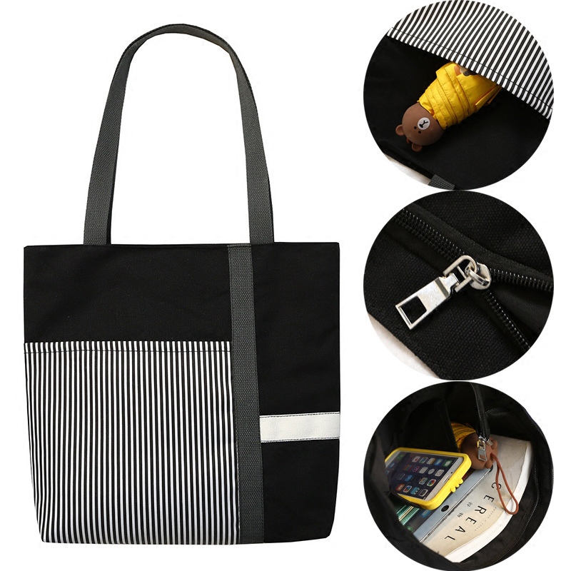 Fashion Canvas Stitching Zipper Closure Large Capacity Stripe Tote Bagshopping Bag
