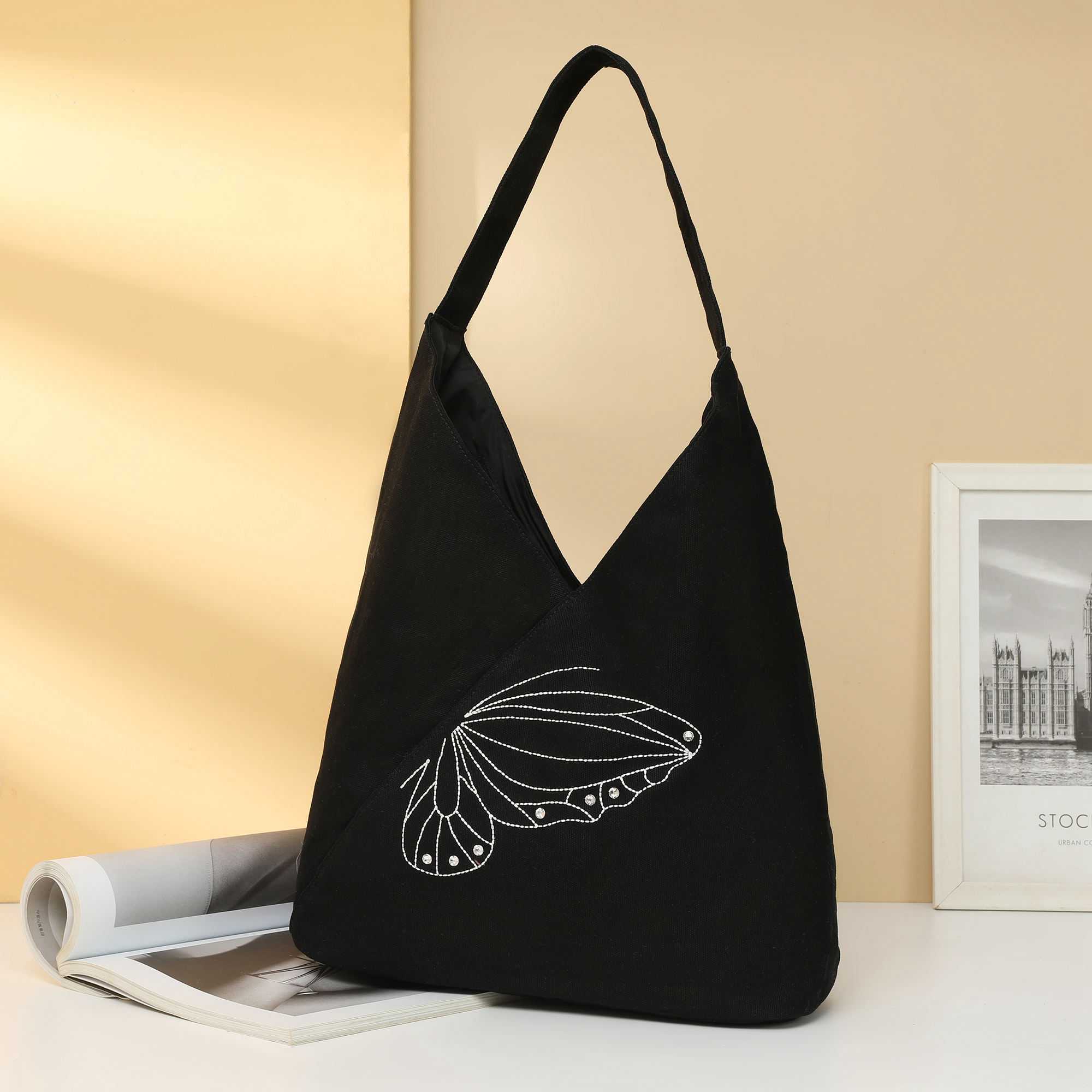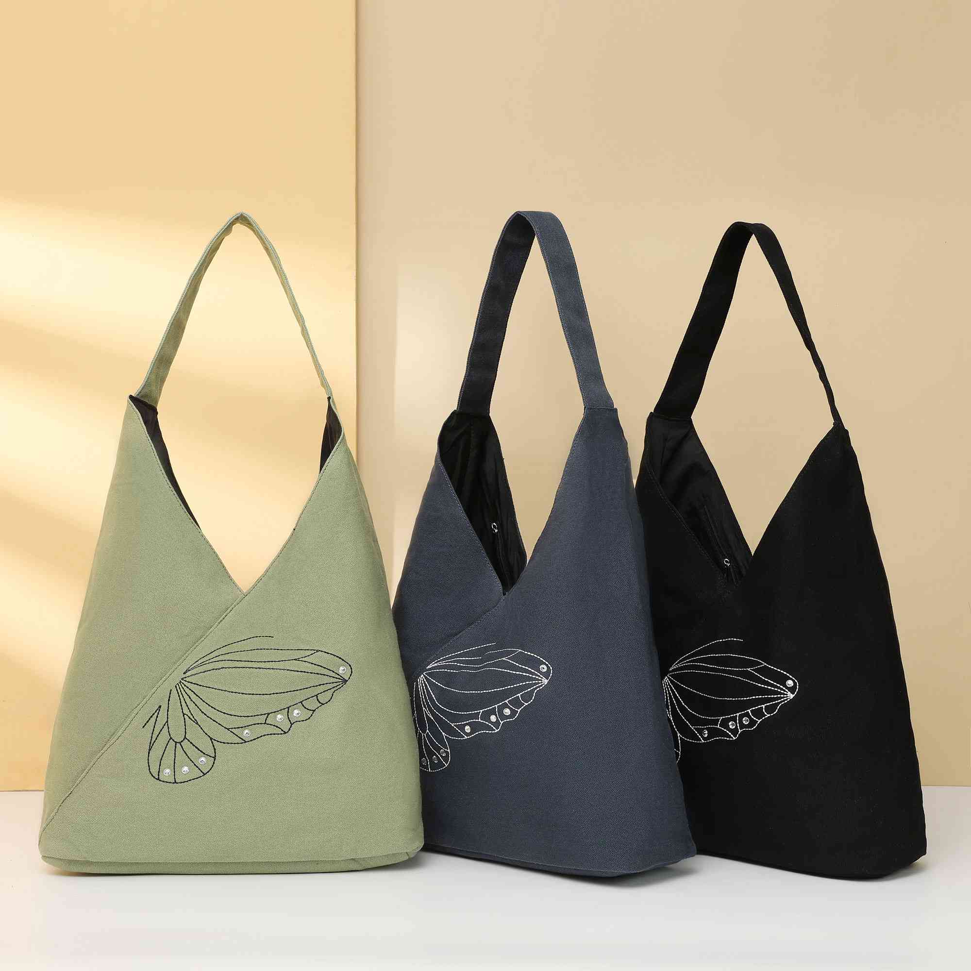 High Quality Butterfly Embroidered with Diamonds Design Reusable Eco Shoulder Bag Wholesale Custom Tote Bag