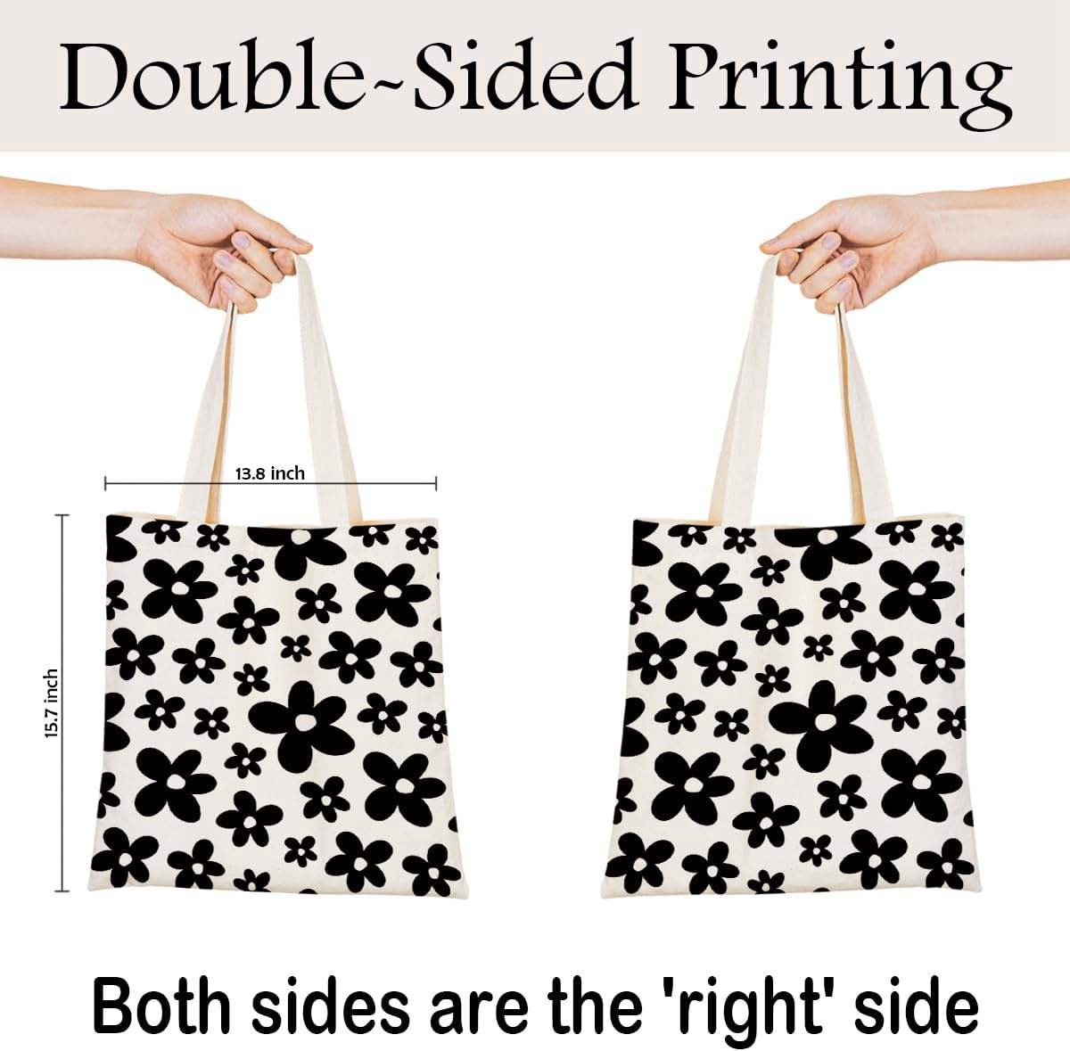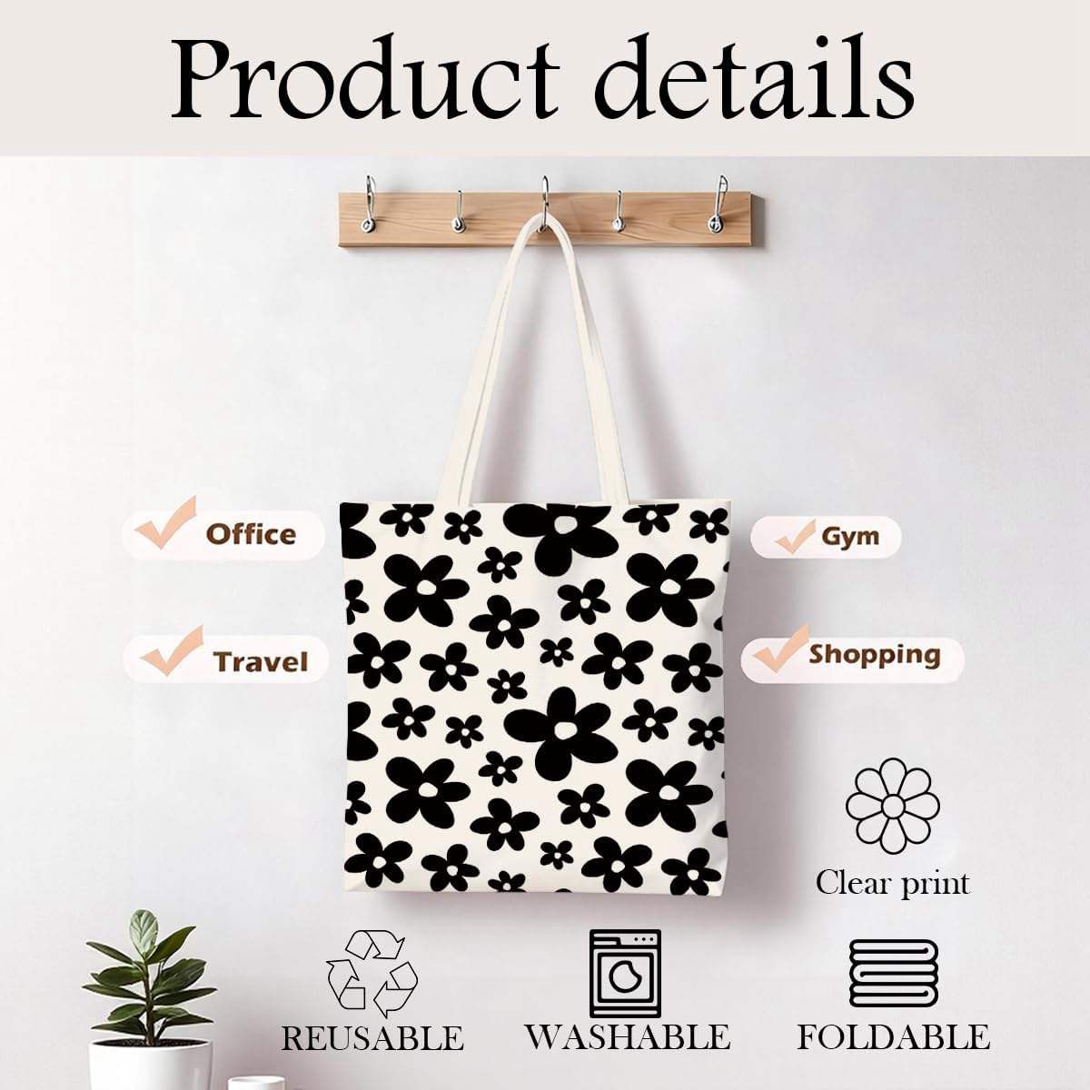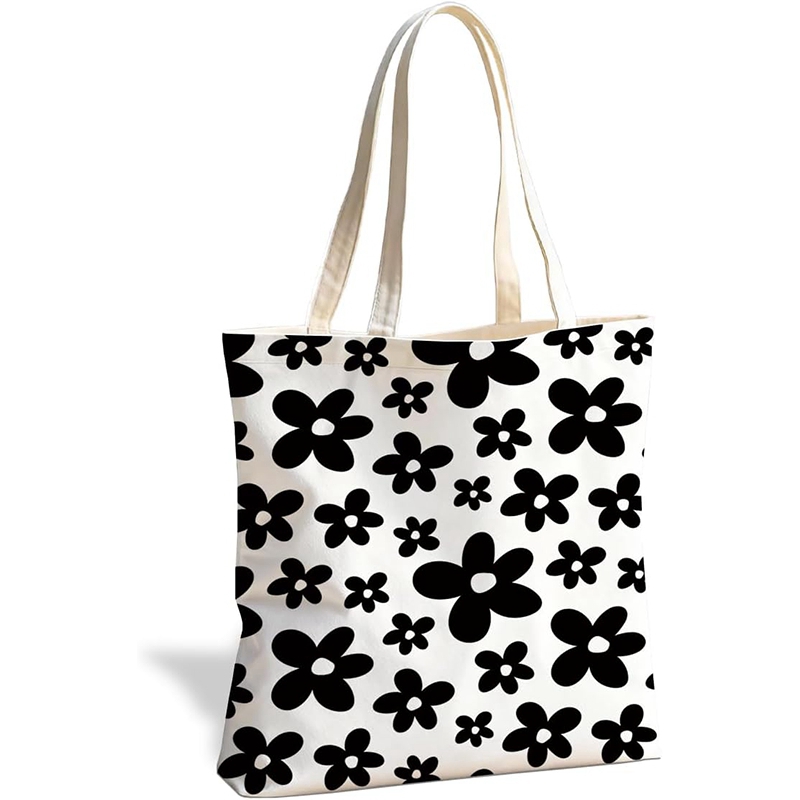 Luxury Storage Tote Bag Black Flower Print Customizable Foldable Reusable Canvas Shopping Bag