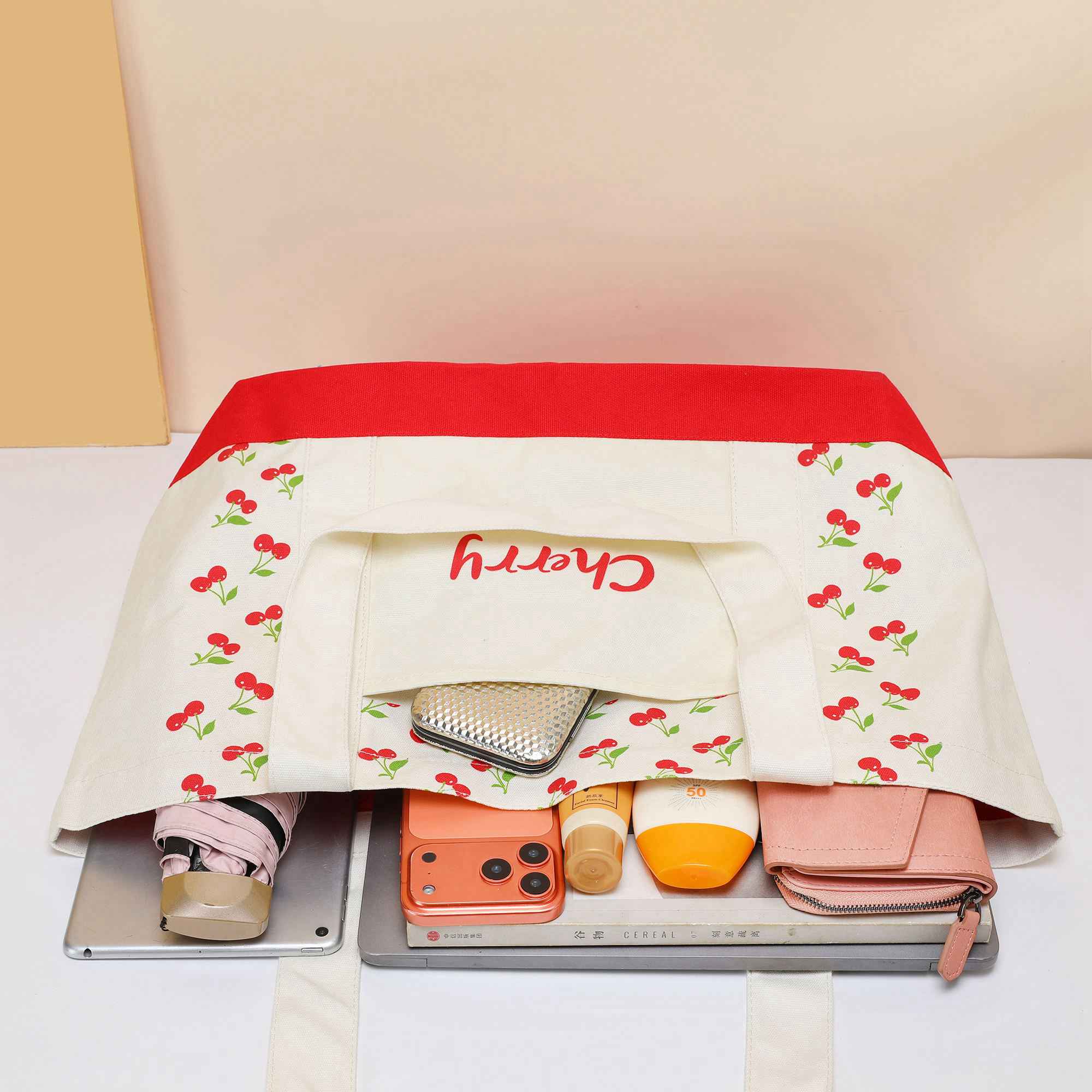 Personalized Cherries Pattern Printing Canvas Tote Bag for Women Custom Logo Shopping Bag
