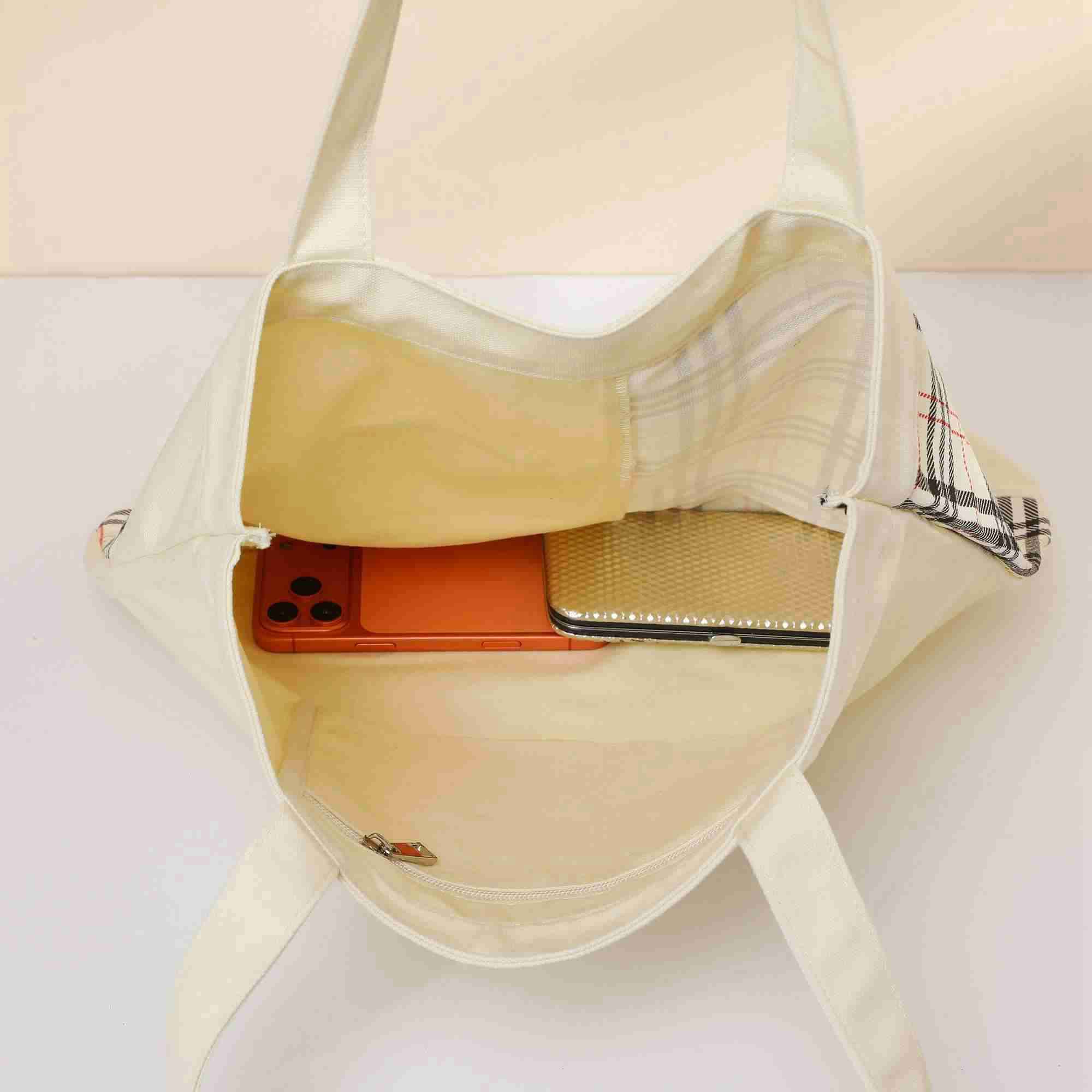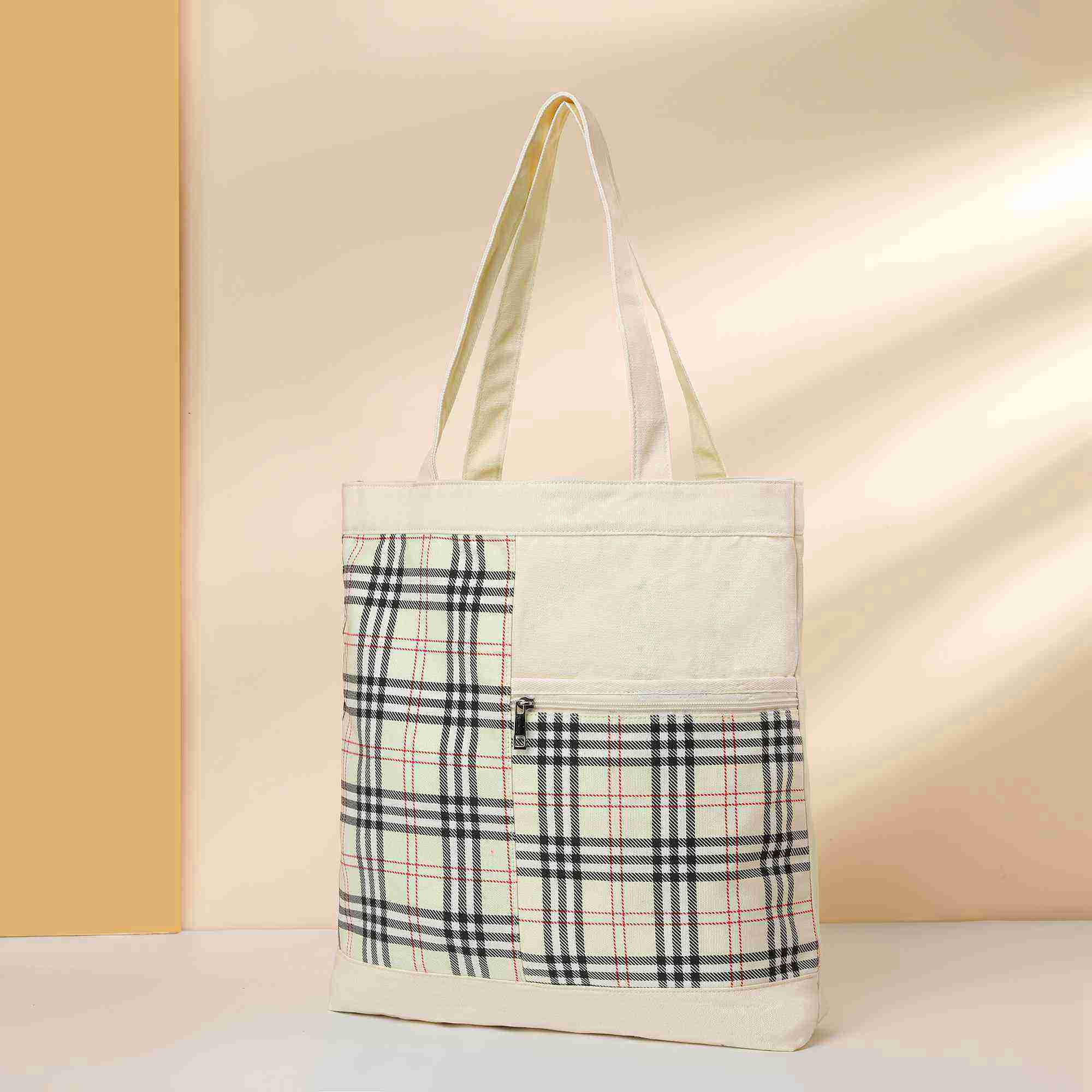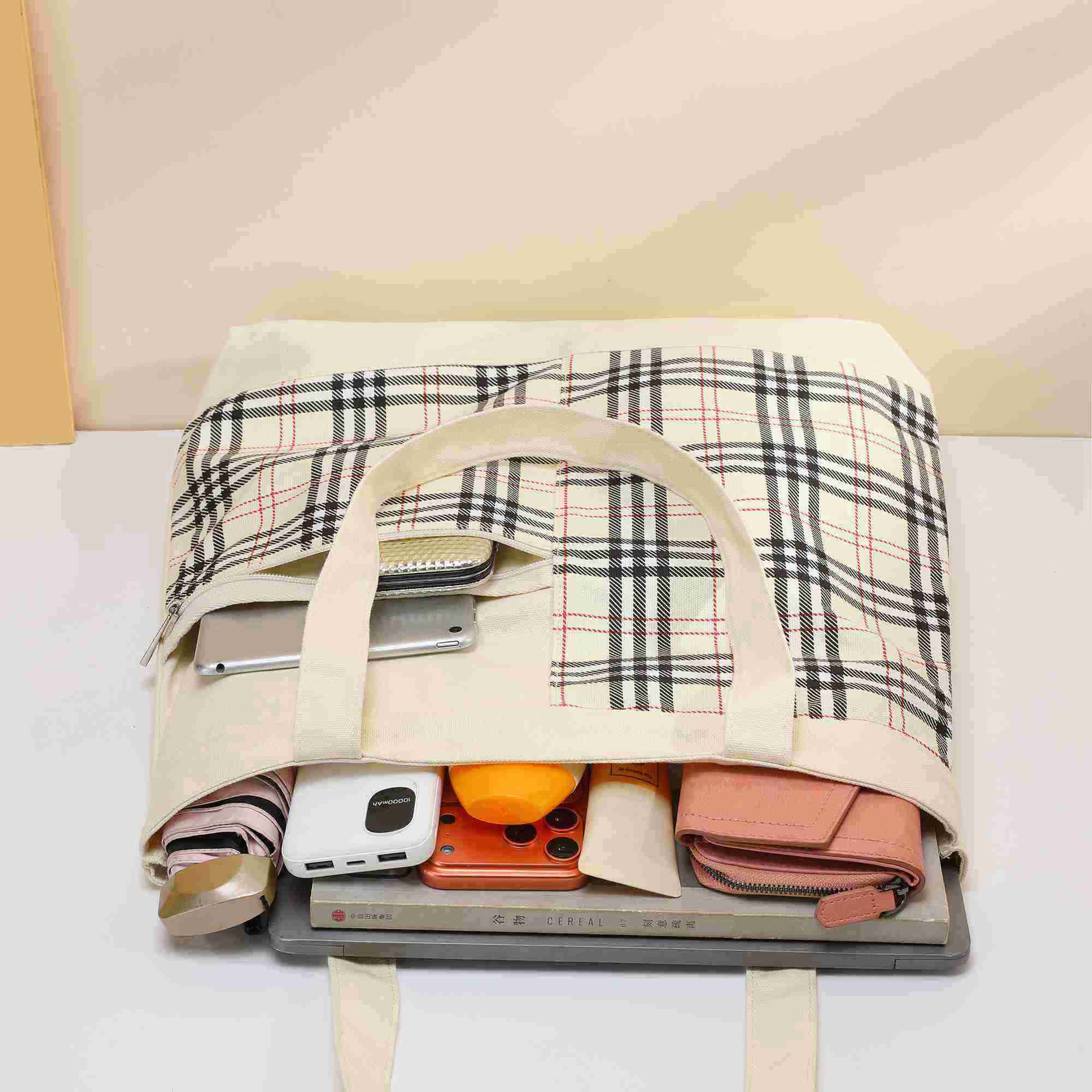 Women's Custom Lattice Pattern Canvas Tote Bag with Printed Logo Reusable Shopping Bag with Outside Zipper